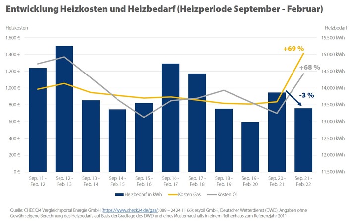 Heizkosten: ermittelt aus dem Heizbedarf und den Preisen für die entsprechende Menge Gas bzw. Heizöl der jeweiligen Periode. Quellen der Preisdaten: CHECK24-Gaspreisindex und esyoil GmbH
