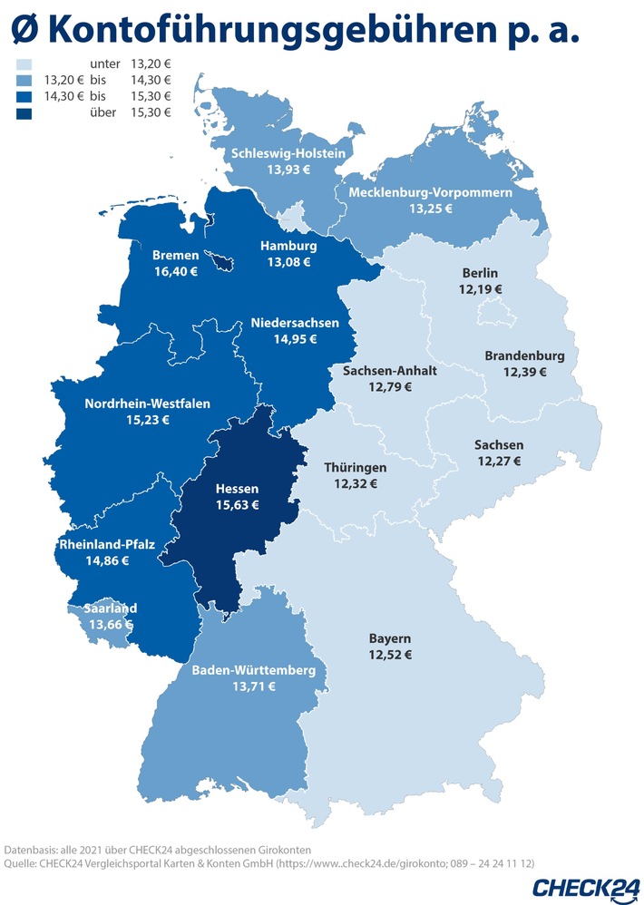 Girokontobesitzer*innen aus Bremen zahlen die höchsten Kontoführungsgebühren. Im Durchschnitt geben sie 16,40 Euro pro Jahr für das Girokonto aus. Auf den weiteren Plätzen der Gebührenrangliste folgen Verbraucher*innen aus Hessen (15,63 Euro) und Nordrhein-Westfalen (15,23 Euro). Das ergab eine Betrachtung aller im Jahr 2021 über CHECK24 abgeschlossenen Girokonten.