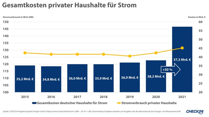 2020 gaben die Deutschen zusammen 38,2 Milliarden Euro aus, obwohl sie mit rund 128 Milliarden kWh nur 2,7 Prozent weniger Strom (https://www.check24.de/strom/) verbrauchten (Vergleich 2021: 131,5 Mrd. kWh). Der Kilowattstundenpreis lag im Schnitt bei lediglich 30 Cent.
