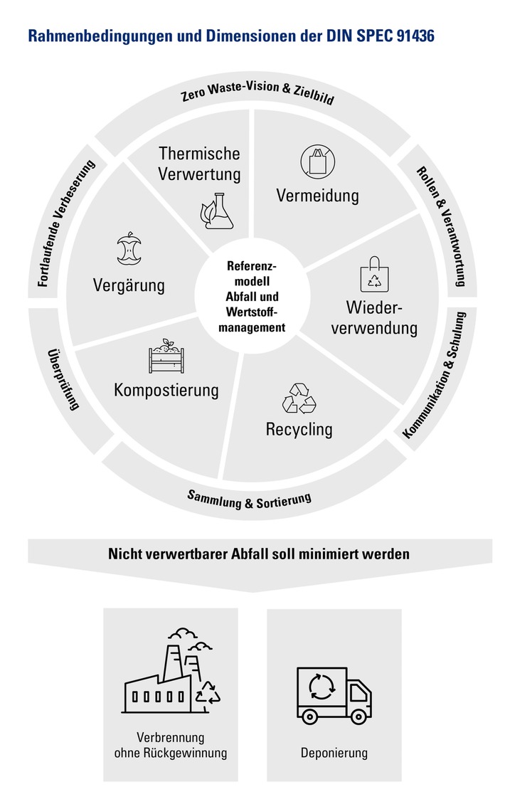 Ziel des nachhaltigen Abfallmanagements gemäß der DIN SPEC 91436 ist es, Reststoffe zu minimieren, nicht vermeidbare Abfälle bestmöglich zu verwerten und den Reifegrad des Abfall- und Wertstoffmanagements zu messen. Die neue Industrienorm geht in ihrem Umfang über das gesetzliche Mindestmaß hinaus und verfolgt mit Blick auf das Thema Nachhaltigkeit einen ganzheitlichen Ansatz, um die Restabfallquote kontinuierlich zu reduzieren - ganz im Sinne der Umwelt. Erarbeitet wurde die Norm von einem Konsortium von Vertretern aus NGOs, Wissenschaft und Wirtschaft, an dem sich auch TÜV SÜD Management Service beteiligte.