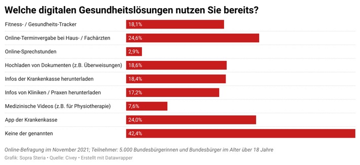 Civey führte im November 2021 im Auftrag von Sopra Steria eine Online-Bevölkerungsbefragung durch. 5.000 Personen wurden gefragt, welche digitalen Gesundheitsservices sie bereits nutzen, ob sie Online-Sprechstunden nutzen würden und zu welchem Zweck.