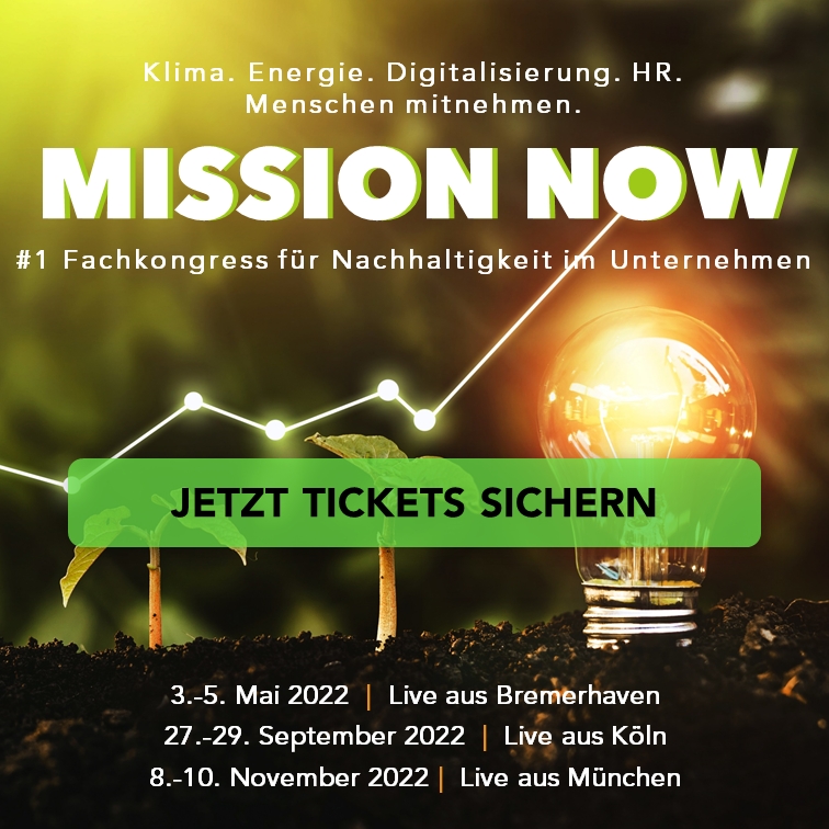 MISSION NOW - die neue Kongress- und Messereihe hat sich zum Ziel gesetzt, digitale, nachhaltige Innovationen für grünere Unternehmen zu unterstützen sowie Firmen konkrete Umsetzungskonzepte und Fördermöglichkeiten zu eröffnen, um die "grüne Revolution" in der Wirtschaft voranzutreiben. Der nächste Kongress in dieser Reihe läuft vom 3. - 5. Mai 2022 in Bremerhaven und wird live ins Internet gestreamt. Informationen & Anmeldung: www.missionnow.de