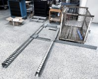 Ein Messe-Highlight ist der innovative Kugelrollen-Eckumsetzer, den die Materialflussexperten aus Bielefeld im vergangenen Jahr entwickelt haben und dessen Prototyp in der Möbelindustrie getestet wurde. Mithilfe des durch Schwerkraft angetriebenen Systems können bis zu 2.500 Kilogramm schwere Ladungsträger mühelos und ressourcenschonend um die Ecke gelenkt werden. Über (Schwerlast-)Rollschienen gelangen sie bis zu der Stelle, an der sie umgelenkt werden sollen. Dort befinden sich Plattformen mit Kugelrollen, die einen Richtungswechsel ermöglichen. Der Prototyp wird in der Möbelindustrie für den Transport von Gitterboxen genutzt. „Wir können das Gerät unter Berücksichtigung individueller Vorgaben aber auch problemlos für den Einsatz in anderen Branchen anpassen“, sagt Eschment.
