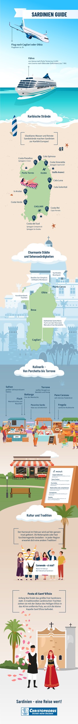 "Die beste Reisezeit für Sardinien ist Mai bis September. Wer zudem spannende, traditionelle Festtage miterleben möchte, sollte Anfang Mai nach Sardinien reisen. Dort findet das Festa di Sant'Efisio statt. Das ist eine traditionelle Prozession, an der jedes Jahr tausende Menschen teilnehmen. Es ist das wichtigste Ereignis der Stadt und ein besonderer Fixpunkt im Kalender. Ebenso außergewöhnlich ist es in Sardinien zur Faschingszeit. Der Karneval im Februar findet auf der ganzen Insel statt und jede Region hat ihre ganz eigenen Traditionen."