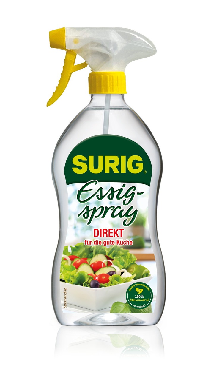 Jetzt neu! Das schnellste SURIG aller Zeiten: Das SURIG Essigspray DIREKT vereint die bewährte Lebensmittelqualität von SURIG mit den Vorteilen einer praktischen Sprühflasche in der bekannten Taillenform. Mit dem Sprühkopf können Kund:innen den gebrauchsfertigen Essig besonders gut und sparsam dosieren - ganz ohne Mischen. Das SURIG Essigspray DIREKT ist ab sofort dauerhaft im Handel erhältlich.