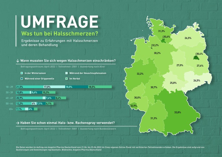 Die Deutschen gehen mit Halsschmerzen nach wie vor recht traditionell um. Das ergab eine repräsentative Umfrage des Markt- und Meinungsforschungsinstituts Civey im Auftrag von Angelini Pharma[1]: