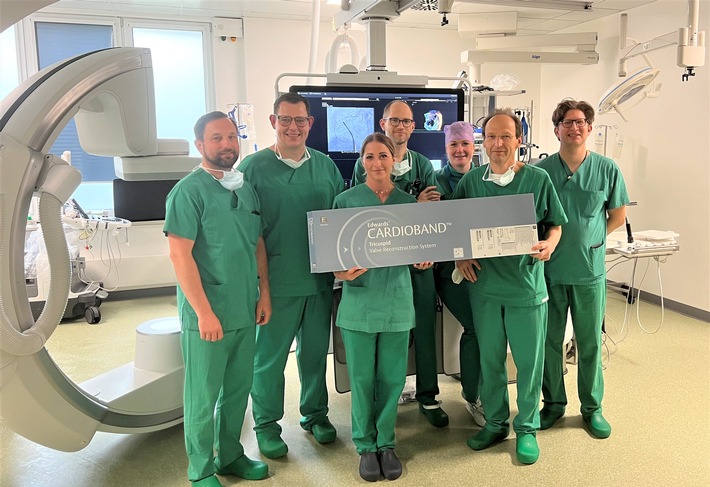 So können auch ältere und schwer kranke Patienten differenziert, schonend und erfolgreich behandelt werden. Das neue Verfahren heißt Cardioband. "Zur Rekonstruktion der Herzklappe zwischen rechtem Herzvorhof und rechter Herzkammer wird per Katheter ein individuell angepasstes spezielles Band über die Leistenvene bis zum rechten Herzen geführt. Damit kann, wie bei einem Gürtel, die Undichtigkeit der Trikuspidalklappe verringert werden, in dem die Ränder der Segel wieder zusammengebracht werden. Der künstliche Klappenring wächst mit der Zeit ein. Vorteil für Patienten: Sie erholen sich schnell, der Eingriff ist minimal invasiv, und gerade ältere und schwer kranke Patienten können so gut therapiert werden", erklärt der Chefarzt der Klinik für Kardiologie und Internistische Intensivmedizin Prof. Harald Lapp (Foto: 2. v. r.).