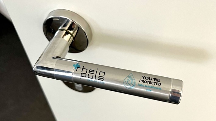 Stark genutzte Oberflächen werden zum Schutz mit der sogenannten "YOU'RE PROTECTED" Antivirenfolie bedeckt, deren Wirksamkeit von führenden medizinischen Laboren bestätigt wurde. Mithilfe der virenabweisenden Folie bietet die Rheinpuls Health Care ihren Kunden einen Rundum-Service für den Schutz gegen Keime, Bakterien und Viren. Unternehmen wie Vertriebe, Hotels, Arztpraxen und Supermärkte können ihren Kunden und Mitarbeitern so einen 99-prozentigen Schutz bieten.