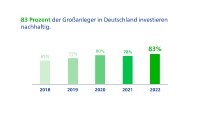 Die Großanleger sind trotz der hohen Verbreitung nachhaltiger Kapitalanlagen weiterhin optimistisch in Hinblick auf die zukünftige Marktentwicklung. So erwarten 85 Prozent, dass das Volumen nachhaltiger Kapitalanlagen in den nächsten zwölf Monaten weiter wachsen wird.