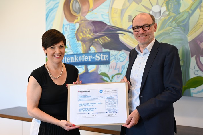 Die Münchener Verein Versicherungsgruppe setzt ihre Hilfsaktion für ukrainische Geflüchtete fort und spendet der Organisation "Münchner Freiwillige - Wir helfen e.V." 50.000 Euro. Den symbolischen Scheck überreichte Dr. Rainer Reitzler, CEO der Münchener Verein Versicherungsgruppe, in der Direktion des Münchener Verein an Petra Mühling, Vorstandsvorsitzende der Freiwilligen.