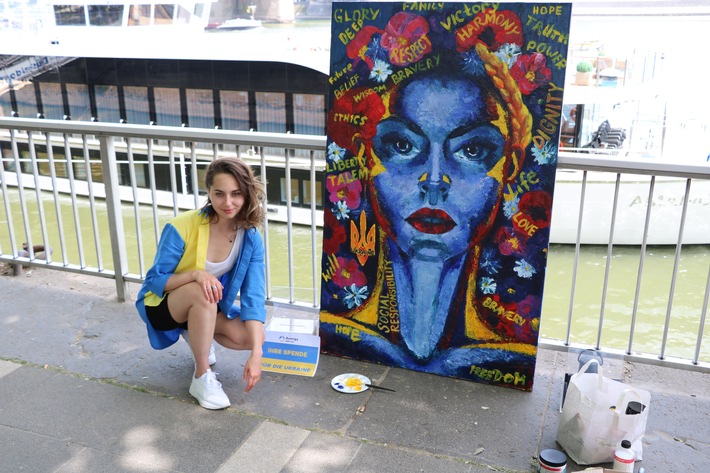 Das Gemälde "Spirit of Ukraine" stand am Samstag, 18. Juni, im Mittelpunkt einer besonderen Aktion in Köln. Die ukrainische Designerin und Künstlerin Viktoriia Kravchenko (28) zeigte ihr großformatiges Bild öffentlich am Rheinufer im Schatten des Kölner Doms. Das Motiv zeigt eine junge Frau mit furchtlosem Blick, die symbolisch für das Land und seine unter dem russischen Angriffskrieg leidende Bevölkerung steht. Das Besondere bei der Aktion am Samstag: Gegen eine Spende konnten Passanten dabei mithelfen, "Spirit of Ukraine" zu vollenden, indem sie selbst einzelne Worte auf die Leinwand schrieben. Das Ergebnis ist eine emotionale Bild-Text-Collage, erschaffen von Vika und vielen weiteren Menschen, die nun für einen guten Zweck versteigert werden soll.