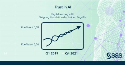 (firmenpresse) - Heidelberg, 28. Juni 2022 --- Künstliche Intelligenz (KI) und Digitalisierung sind in der deutschsprachigen Öffentlichkeit in den vergangenen drei Jahren praktisch zum Synonym geworden. Das ist ein Ergebnis der Langzeituntersuchung "Trust in AI Index" von SAS. Demnach war die Korrelation zwischen den beiden Schlagworten in der öffentlichen Diskussion vor gut drei Jahren noch eher schwach - Stand heute (erstes Quartal 2022) werden die beiden Begriffe in einem Atemzug genannt.