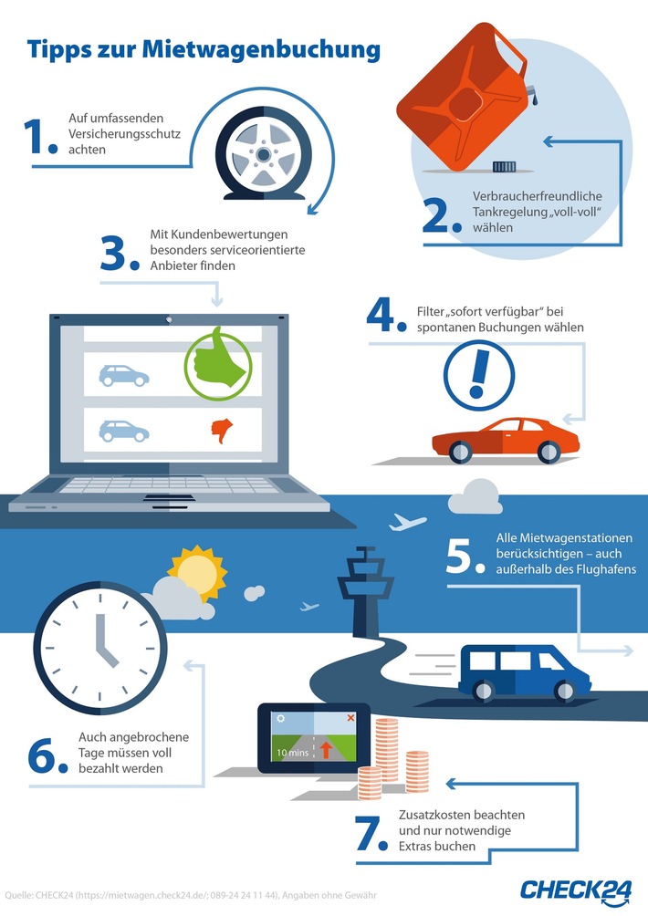 In einigen Bundesländern haben die Sommerferien bereits begonnen, in anderen stehen sie noch an. Damit mit dem Mietwagen in den Ferien alles glatt geht, hat CHECK24 Tipps zur Buchung, Abholung und Rückgabe zusammengestellt und erklärt die richtige Verwendung hilfreicher Vergleichsfilter. Im ersten Teil geht es um die sieben wichtigsten Hinweise zur Buchung: