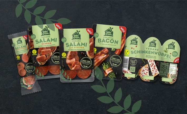 Drei vegane Salami-Variationen, vegane Schinkenwürfel und veganer Bacon: Mit insgesamt fünf Produkten auf Basis von Weizenprotein kommt die New-Food-Marke "Billie Green" aus dem Hause InFamily Foods am 5. September in den Handel. Dank eines patentierten Herstellungsverfahrens und optimaler Produktionsbedingungen ist es dem Familienunternehmen gelungen, ein besonders authentisches Geschmackserlebnis zu kreieren und dabei als einer der ersten Hersteller in Deutschland auf den Einsatz von Zusatzstoffen für das gesamte Sortiment zu verzichten.