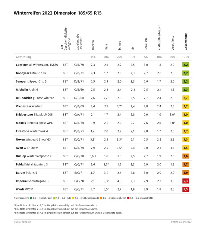 In der Dimension 185/65 R15 (T) für VW Polo, Audi A1 oder Opel Corsa sind die Reifen von Continental, Goodyear, Semperit und Michelin sehr ausgewogen, zeigen insbesondere auf Nässe, Schnee und trockener Fahrbahn gute Leistungen und bekommen daher das ADAC Urteil "gut". Danach folgt ein breites Mittelfeld, das mit wachsenden Einschränkungen parallel zu den absteigenden Platzierungen empfohlen werden kann. Hier spart ein genauer Blick in die Ergebnistabelle bares Geld, denn in dieser Dimension sind die guten Reifen nicht sehr viel teurer als die Modelle mit Einschränkungen.