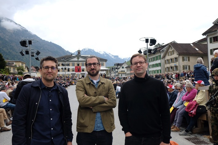 Seit vier Jahren besprechen Florian Gasser (Österreich), Matthias Daum (Schweiz) und Lenz Jacobsen (Deutschland) in dem Podcast "Servus. Grüezi. Hallo." aktuelle Themen, die die 3sat-Länder bewegen. Jetzt sind die drei ZEIT-Journalisten für eine 3sat-Dokumentation unterwegs und zeigen unter anderem, was eine singende Wirtin aus Kitzbühel, ein Fußballspiel im Ruhrgebiet und die Landsgemeinde in Glarus gemein haben. 3sat zeigt "'Servus. Grüezi. Hallo.' - unterwegs" am Mittwoch, 12. Oktober 2022, um 20.15 Uhr in Erstausstrahlung. Die Dokumentation steht ab Sendedatum unbegrenzt in der 3satMediakthek zur Verfügung.