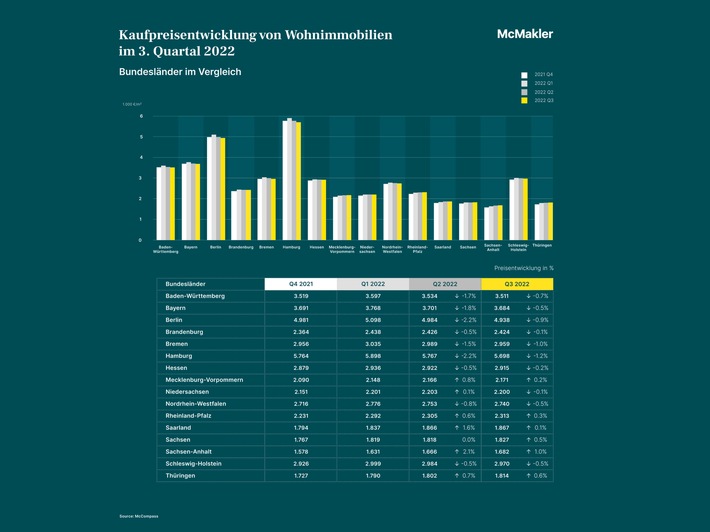 Der deutsche Immobilienmarkt ist weiterhin stark von den aktuellen Geschehnissen rund um Energiekrise, Zinssteigerung und Inflation geprägt. Dies spiegelte sich bereits im zweiten Quartal in den erstmals sinkenden Kaufpreisen wider. Der Negativtrend setzt sich zwischen Juli und September fort, wie die aktuelle Auswertung von McMakler Research, der Plattform für Immobilienmarktanalysen von McMakler, zeigt. Des Weiteren lässt sich eine steigende Nachfrage nach Immobilien mit erneuerbarer Energieversorgung beobachten. Der Marktreport umfasst die Kaufpreis-, Nachfrage- sowie Angebotsentwicklung in den deutschen Bundesländern und den Top-7-Städten im dritten Quartal 2022. Ergänzend wurden die von McMakler ausgestellten Energieausweise* ausgewertet, um die Nachfrage- und Preisgestaltung von Immobilien mit Blick auf die jeweilige Versorgungsart zu untersuchen. Die Analyse basiert u.a. auf den realen Transaktionsdaten von McMakler und bildet daher das momentane Marktgeschehen ab.