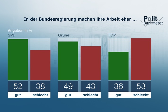 Insgesamt erhält die Bundesregierung aktuell eher bescheiden positive Zufriedenheitswerte. Die einzelnen Regierungspartner werden dabei ganz unterschiedlich beurteilt: Während die meisten mit der Arbeit der SPD (gut: 52 Prozent; schlecht: 38 Prozent) und der Grünen (gut: 49 Prozent; schlecht 43 Prozent) in der Regierung eher zufrieden sind, meint eine Mehrheit von 53 Prozent, dass die FDP in der Regierung eher eine schlechte Arbeit macht. Nur 36 Prozent eher eine gute.