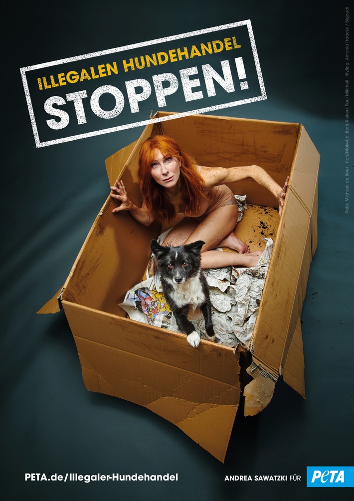 Eine Herzensangelegenheit: Andrea Sawatzki engagiert sich jetzt mit einem neuen Motiv (https://www.peta.de/prominente/andrea-sawatzki-hundehandel/) gegen illegalen Hundehandel. Für PETA ist die beliebte Schauspielerin, Autorin und Sprecherin in die Rolle eines eingeschüchterten Vierbeiners geschlüpft. Zusammen mit Hund Romy sitzt sie zusammengekauert und verängstigt in einem Karton. Eingesperrt in verdreckten Kisten oder Transportboxen werden täglich unzählige Hunde Hunderte von Kilometern transportiert, um in Deutschland von dubiosen Händlern verkauft zu werden. Fotografiert wurde das Motiv vom Hamburger Michael de Boer, der PETA seit vielen Jahren pro bono unterstützt.