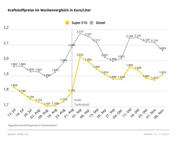 Für die Fahrer von Diesel-Pkw hat sich beim Tanken eine leichte Entspannung bemerkbar gemacht. Der Preis für Diesel-Kraftstoff ist binnen einer Woche laut aktueller ADAC Auswertung um 5,1 Cent je Liter gesunken und liegt damit im bundesweiten Mittel bei 2,065 Euro. Verteuert hat sich hingegen Benzin: Ein Liter Super E10 kostet 1,910 Euro - ein Anstieg von 3,7 Cent gegenüber der Vorwoche, trotz des im Wochenvergleich kaum veränderten Ölpreises.