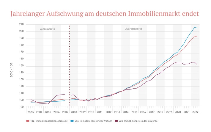 "Die zahlreichen Belastungsfaktoren für die Volkswirtschaft insgesamt und damit auch für den Immobilienmarkt, wie zum Beispiel gestiegene Zinsen und Inflationsraten, reale Einkommenseinbußen bei potenziellen Käufern und anhaltende politische und wirtschaftliche Unsicherheiten, schlagen sich sukzessive im vdp-Index nieder. Nachdem die Preise für Wohnimmobilien mehr als zwölf Jahre lang gestiegen sind, sind sie nun erstmals wieder leicht gefallen - der jahrelange Aufwärtstrend bei Wohnimmobilienpreisen ist somit zu Ende", erklärte vdp-Hauptgeschäftsführer Jens Tolckmitt, der zugleich versicherte: "In herausfordernden Zeiten hat der Immobilienmarkt in Deutschland stets seine Robustheit unter Beweis gestellt. Wir gehen per heute davon aus, dass dies auch jetzt wieder so sein wird."