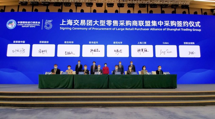Insgesamt 33 Shanghaier Partnerunternehmen der großen Einzelhandelskäufer-Allianz, darunter Bailian Group, Bright Food Group und Carrefour, unterzeichneten mit globalen Ausstellern und Marken Beschaffungsverträge.