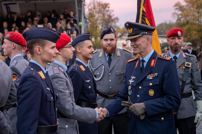Der feierlichste Moment wurde vom Heeresmusikkorps Koblenz mit dem Choral "Altniederländisches Dankgebet" aus dem 16. Jahrhundert eingeleitet. Stellvertretend für ihre Kameradinnen und Kameraden der Logistikbataillone 461 und 467 aus Walldürn und Volkach sowie des ABC-Abwehrbataillons 750 aus Bruchsal traten die Rekrutenabordnungen an die gesenkten schwarz-rot-goldenen Truppenfahnen. Die jungen Soldatinnen und Soldaten legten ihre linke Hand an den Fahnenstock und gelobten, "der Bundesrepublik treu zu dienen und das Recht und die Freiheit des deutschen Volkes tapfer zu verteidigen". Rund 600 Familienangehörige und 250 geladene Gäste waren nach Brühl gekommen, um diesen besonderen Moment mitzuerleben.