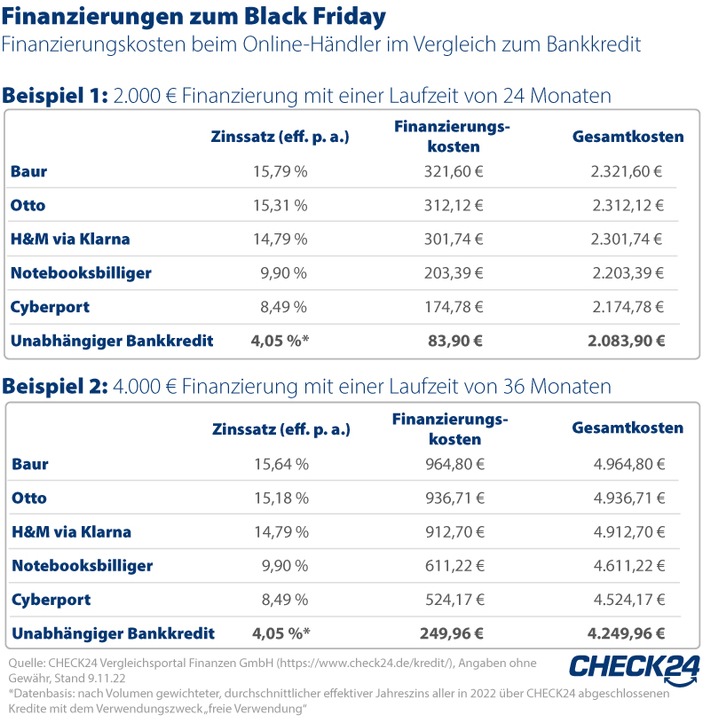 1Quelle: Auswertung der Finanzierungskosten bei elf Online-Händlern, Stand 9.11.22