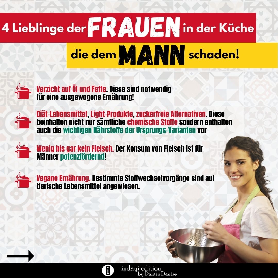 Frauen kochen vorwiegend für sich selbst, um den eigenen Körper bestmöglich gesund und stark zu erhalten sowie für ihren Nachwuchs. Da sie nicht wie früher (evolutionsbedingt, kriegsbedingt etc.) vom Mann abhängig sind, schreiben die inneren Instinkte nicht mehr vor, den Erhalt, die Kraft, Stärke und die Gesundheit des Mannes zu schützen, mit dem, was sie kochen. Die Folgen können für den Mann tödlich sein! In “Frau am Herd ist schuld an Männerproblemen” erläutert Dantse Dantse unter anderem vier Ernährungs-Lieblinge, die Frauen in der Küche für ihre weibliche Ernährung bevorzugt nutzen, damit aber dem Mann schaden.