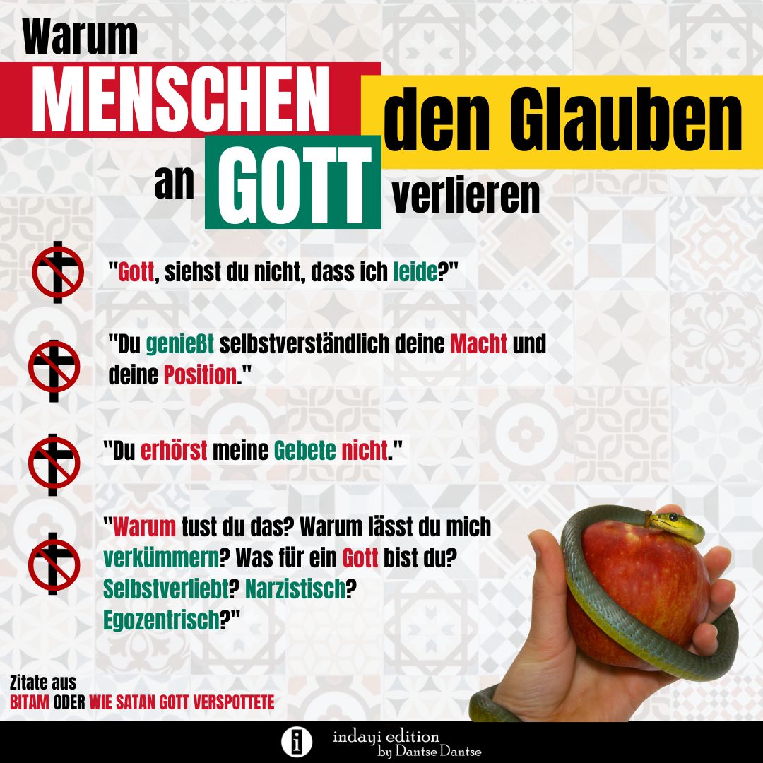 Eine Frage, die sich sehr viele Menschen stellen, bevor sie ihren Glauben verlieren und sich möglicherweise sogar dem Satan zuwenden. Auch der Protagonist aus dem neuerschienenem Roman “Bitam oder wie Satan Gott verspottete” von Dantse Dantse, stellte sich diese Frage und klagte Gott an. In diesem Beitrag sehen wir, anhand eines Auszugs des Romans, wieso heutzutage viele Menschen ihren Glauben verlieren.
