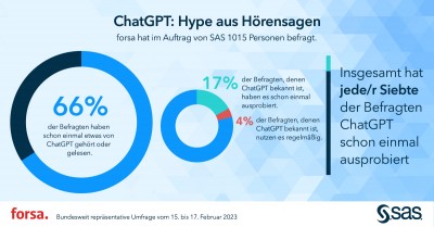 (firmenpresse) - Heidelberg, 10. März 2023 - Zwei von drei Deutschen kennen ChatGPT, die meisten allerdings nur vom Hörensagen. Das hat eine repräsentative Befragung von forsa im Auftrag des Analytics- und KI-Anbieters SAS ergeben.