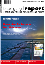 Der BeteiligungsReport® begleitet seit mittlerweile sieben Jahren den Markt der geschlossenen Fonds. Brancheninsider, unabhängige Journalisten und Marktteilnehmer informieren aus ihrer jeweiligen objektiven Sicht über klassische Themen durch viele Grafiken, Kurzberichten und Tabellen über den Gesamtmarkt. Der BeteiligungsReport® ist mit einer Verbreitung an rund 400.000 Leser (Print und Online) eine der führenden Publikationen im Markt der geschlossenen Fonds.