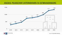 Doch nicht nur polnische Fach- und Arbeitskräfte interessieren sich für Ostbrandenburg. Auch polnische Unternehmer gründen Firmen in der Region zwischen Berlin und Polen. Dabei sind die Steigerungsraten erstaunlich: Waren es im Jahr 2015 noch 283 Unternehmen mit polnischen Inhabern oder Geschäftsführern, so stieg diese Zahl kontinuierlich auf 1345 Unternehmen Mitte 2023. Diese Zahlen beziehen sich auf Daten aus dem Bereich der Industrie- und Handelskammer Ostbrandenburg (vgl. Grafik). Das heißt, Handwerksunternehmen oder Freiberufler sind nicht mitgerechnet.??