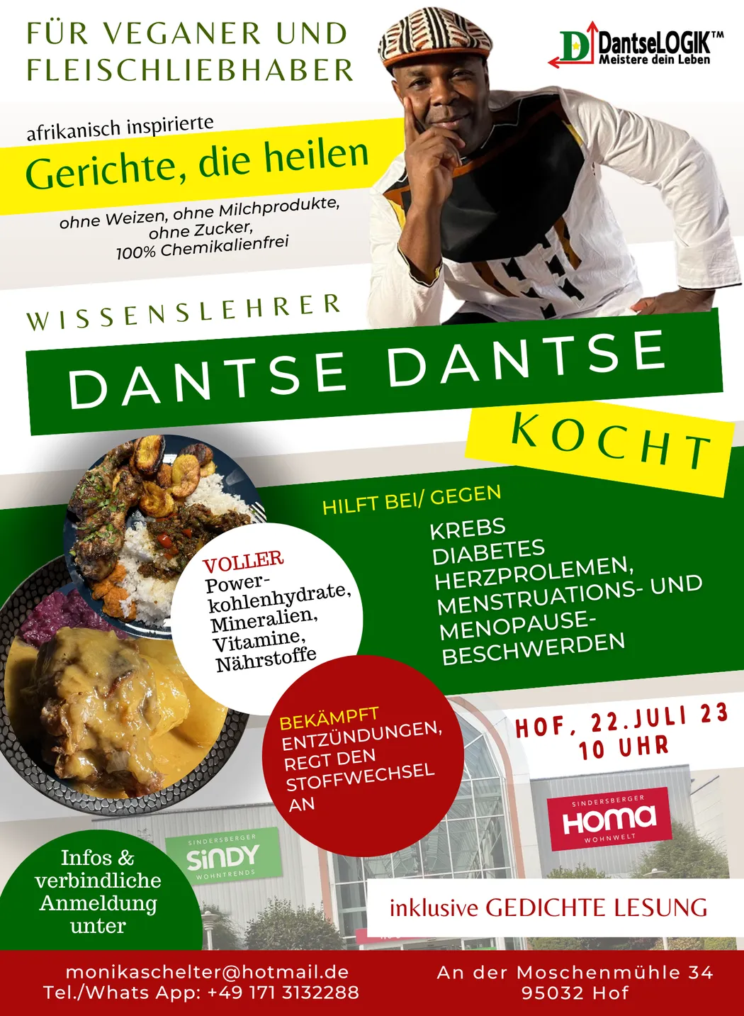 Im Mittelpunkt des Events steht natürlich das Kochen. Dantse Dantse persönlich führt die Teilnehmer in die Geheimnisse der DantseLogik Meister-Küche ein. Dabei können sie hautnah erleben, wie sich afrikanische Geschmackswelten entfalten, von bitter bis süß, von pikant bis sauer. Doch nicht nur der Geschmack, sondern auch die heilsame Wirkung der ausgewählten Zutaten soll im Fokus stehen. Eine wahre Entdeckungsreise für den Gaumen und die Gesundheit!