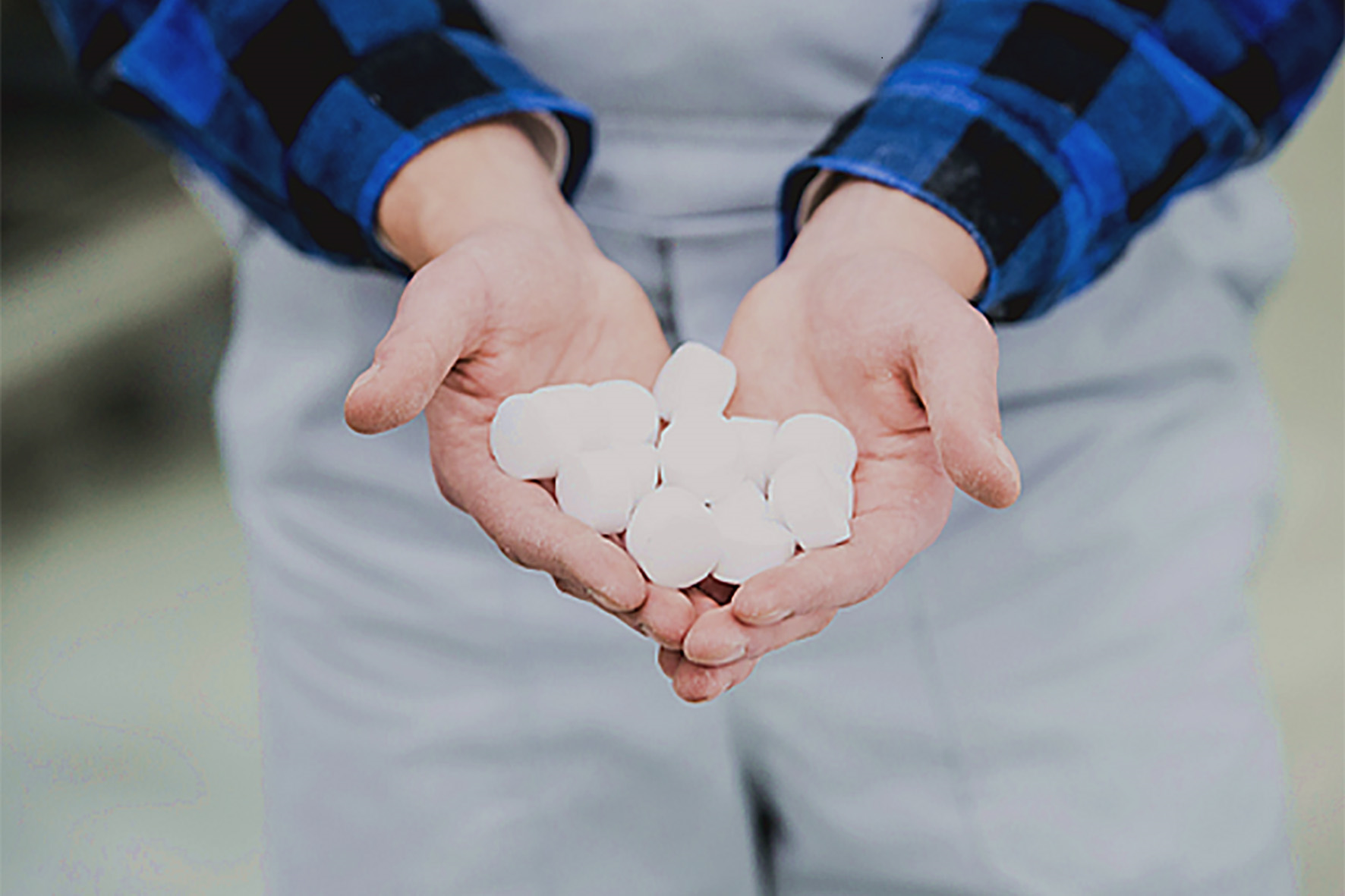 Die Enthärtungsanlage entzieht dem Trinkwasser die härtebildenden Mineralien Magnesium und Kalzium per Ionenaustauschverfahren. Das erfolgt durch spezielle Salztabletten aus Natriumchlorid. „Diese richten sich nach den Reinheitsanforderungen der DIN EN 973, der wir mit unseren AQUA-PRO-Salztabletten mit der maximalen Reinheit von 99,9% entsprechen“, ergänzt Jan Döge. In der Anlage befindet sich ein Tauscherharz, an dem sich die aus den Salztabletten gewonnenen Natrium-Ionen anlagern. Das Wasser wird weich, sobald es über das Tauscherharz fließt.
