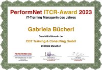 (PresseBox) - Gabriela Bücherl, Geschäftsführerin der Münchener CBT Training & Consulting GmbH, wird für ihre Leistung und ihre herausragenden Beiträge zur Diversifizierung der IT-Training-Branche der diesjährige PerformNet ITCR-Award 2023 verliehen. Sie wird mit diesem renommierten Preis als IT-Training Managerin des Jahres 2023 ausgezeichnet.