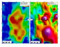 Die Firma Atlas Drilling Ltd. aus Kamloops (BC) wurde beauftragt, das Phase-Eins-Bohrprogramm im Gesamtumfang von etwa 2.000 Metern zu absolvieren. Das Projekt wird vom Camp am Standort der Mine Huckleberry, etwa 88 km west-südwestlich von Houston (BC), aus durchgeführt. Das erste Bohrloch wird auf das nördlichste Zentrum der beiden IP-Anomalien abzielen, die im Rahmen der vor Kurzem abgeschlossenen geophysikalischen Vermessungen – magnetische Flugmessungen und 3D-IP-Untersuchungen - definiert wurden, wie vom Unternehmen in seiner Pressemeldung vom 31. Juli 2024 ausführlich beschrieben. Die geophysikalischen Messungen deuten auf das Potenzial für zwei porphyrische Cu-Mo-Mineralisierungszentren hin (Abb. 1). Das nördlichste Zentrum deckt sich mit einer porphyrischen Cu-Mo-Mineralisierung, die an der Oberfläche zu Tage tritt, und ein übereinstimmendes Magnetik-/Widerstandshoch umfasst, das von einem großen, „doughnut“-förmigen Aufladbarkeitshoch (> 35 mV/V) mit einem Durchmesser von etwa 1 km umgeben ist. Ein zweites potenzielles Porphyr-Cu-Mo-Zentrum befindet sich etwa 1,1 km weiter südlich und umfasst ein ähnliches Magnetik-Hoch, das von einem „doughnut“-förmigen Aufladbarkeitshoch (> 35 mV/V) umgeben ist. Dieses südliche potenzielle Porphyrzentrum mit einem Durchmesser von etwa 850 Metern ist vollständig von Deckschichten überlagert.