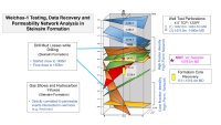 Die perforierten Abschnitte befinden sich oberhalb von Bruchzonen in der Steinalm-Formation, in denen während der Bohrung Kohlenwasserstoffanzeichen beobachtet wurden, und darüber, wo Öl von einem modularen Formationsdynamiktester (MDT) im Bohrloch gewonnen wurde, sowie über Abschnitten, in denen während der Bohrung Kohlenwasserstoffzuflüsse festgestellt wurden, und über dem Abschnitt, aus dem ein Bohrkern mit Fluoreszenz aus der Formation geborgen wurde (siehe Abbildung 1). Die Abbildung zeigt durchlässige Bereiche im Bohrloch mit Gaszuflüssen und Kohlenwasserstoffanzeichen, die während der Bohrung angetroffen wurden und mit diesen durchlässigen Bereichen (z. B. Klüfte) korrelieren.