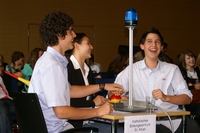 Ein dumpfer Ton erklingt. "Um welches Instrument handelt es sich?", fragt IHK-Projektleiter Uwe Deubel in die Runde. Team rot ist am schnellsten: "Ein Didgeridoo", antwortet Victoria. Lautstarke Unterstützung erhalten die Kombattanten von ihren Klassenkameraden, die alle zur IHK gekommen sind. "Auch wenn ihr Angst habt, ist es wichtig, sich der Aufgabe zu stellen", ermuntert Deubel die Teilnehmer des Spiels.