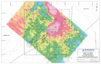 - Die Magnetfeldergebnisse zeigten mehrere starke magnetische Körper mit zahlreichen schwachen kurzwelligen Körpern um die dominierenden Merkmale herum. Diese Fülle an starken Gradienten, die in dem ersten derivativen Ergebnis beobachtet wurde, deutete an, dass das Gebiet eine starke strukturelle Umformung und Verwerfung durchlaufen hatte. Dies ist eine wichtige Komponente für Lagerstätten im Diskordanzstil, die am Kontakt zwischen den aufliegenden Sedimenten und dem Grundgebirge eingelagert sind.