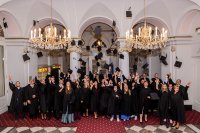 Das traditionelle Gruppenfoto mit Hüte-Wurf durfte auch beim diesjährigen Absolventenball nicht fehlen. Die dabei entstandene ausgelassene Stimmung übertrug sich auf die Tanzfläche, die sich in diesem Jahr besonders schnell füllte.