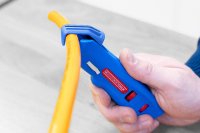 Das Messer verfügt über einen Haltebügel aus glasfaserverstärktem Polyamid und ist für alle gängigen Rundkabel mit einem Durchmesser von 4-28 mm geeignet. Mit dem drehbaren Innenmesser können Rund-, Längs- und Spiralschnitte sowohl an weichen als auch an harten Kabelisolierungen durchgeführt werden. Die Schnitttiefe ist per arretierbarem Stellrad in 0,1 mm-Schritten von 0-3 Millimeter präzise einstellbar.