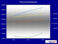 Auch bei 16-Zoll-Notebooks, die im Mai noch eine Preissenkung erfuhren, stiegen die Preise nun deutlich an. Rund 12 Prozent mehr als im Mai mussten Interessenten im Monat Juni dafür ausgeben. Aber auch hier gibt es Gegentendenzen: Von April auf Juni fielen die Preise für 16-Zoller des Herstellers Packard Bell um ganze fünf Prozent auf durchschnittlich 633 Euro. Ein Preisvergleich lohnt sich!