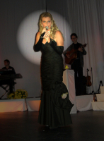 Nach der Pause wollte man Augen nicht trauen, denn DAGMAR LAY D. fuhr mit einer Harley Davidson Sportster Custom auf die Bühne. Eine kleine Reminiszenz an ihre sportliche Vergangenheit als "Deutscher Juniorenmeisterin" im Motorrad - Trial. Erstaunlich, wie die zarte Lady diese schwere Maschine auf so kurzem Wege beherrschte. Im neuen Outfit wurde ein weiterer bunter Melodienstrauss von eigenen Hits und Evergreens präsentiert. "Gelbe Rosen" durften dabei nicht fehlen, die Fans honorierten es dankbar und überschütteten die Künstlerin (wie immer nach diesem Lied) mit Sträussen dieser edlen Blumensorte. Einmal in Stimmung improvisierte das begeisterte Publikum Servietten zu Lassos um und unterstütze beim "Yah Yah Yippie Yippie Yeh" durch singen, schwingen und klatschen.