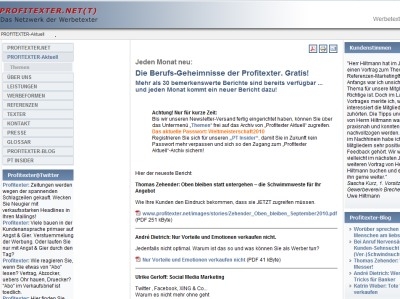 PROFITEXTER.NET(T) wurde 2006 gegründet als bundesweites Netzwerk professioneller Werbetexter, die ihre Ausbildung bei der VNR Verlag für die deutsche Wirtschaft AG absolviert haben. Dem Netzwerk gehören derzeit 12 Texterinnen und Texter aus ganz Deutschland an. Die Mitglieder stammen aus verschiedenen Fachbereichen und decken so von Lifestyle-Mode, Internet-Marketing, Finanzen, Elektrotechnik bis zum Handwerk die unterschiedlichsten Branchen ab.