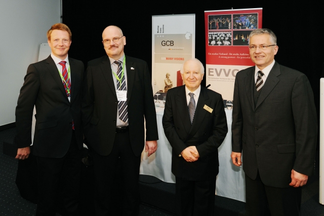 v.l.n.r.: Matthias Schultze, Geschäftsführer des GCB German Convention Bureau e.V., Joachim König, Präsident des Europäischen Verbands der Veranstaltungs-Centren e.V. (EVVC), Ray Bloom, Chairman der IMEX sowie Prof. Dr. Michael-Thaddäus Schreiber, Geschäftsführer des Europäischen Instituts für TagungsWirtschaft GmbH (EITW), präsentierten bei der Pressekonferenz "Meeting- & EventBarometer 2011" auf der IMEX in Frankfurt neueste Forschungsergebnisse zum deutschen Tagungs- und Kongressmarkt.