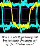 Der dunkle Bereich innerhalb der Signale wird als "Datenauge" bezeichnet - die Datenaufzeichnung in dieser Zone führt zu verlässlichen Daten (Bild 1: lila Quadrate). Steigt jedoch die Frequenz, wird die Datenaufzeichnung zur Herausforderung durch steigende Signalverzerrung wie z.B. Rauschen, Dämpfung, Übersprechen, Reflexion, Potenzialver-schiebung. Wie aus Bild 2 ersichtlich wird, schrumpft bei höheren Frequenzen das Datenauge (lila Kreise) und das Taktsignal muss verschoben werden (lila Pfeile).