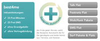 best4me ist für jeden Handynutzer die richtige Wahl - für Nur-Telefonierer, Festnetz-Anrufer, SMS-Fans oder Handysurfer. Eine Festnetzflat sowie eine SMS Flat gibt es für nur 9 Euro im Monat, Mobilfunktelefoniepakete gibt es bereits ab 4,50 Euro pro Monat, sowie drei verschiedene Surf-Optionen ab 4,50 Euro monatlich. Ein weiteres Plus: Alle Pakete und Flatrates sind deutlich günstiger als vergleichbare Angebote von Wettbewerbern (z.B. Base). Außerdem nutzt best4me ein hervorragend ausgebautes Mobilfunknetz (Netztest der Zeitschrift Connect: Telefonie Platz 1) mit ausgezeichneter Sprachqualität und Highspeed-UMTS per HSDPA und einer Übertragungsgeschwindigkeit von bis zu 7,2 MBit/s.