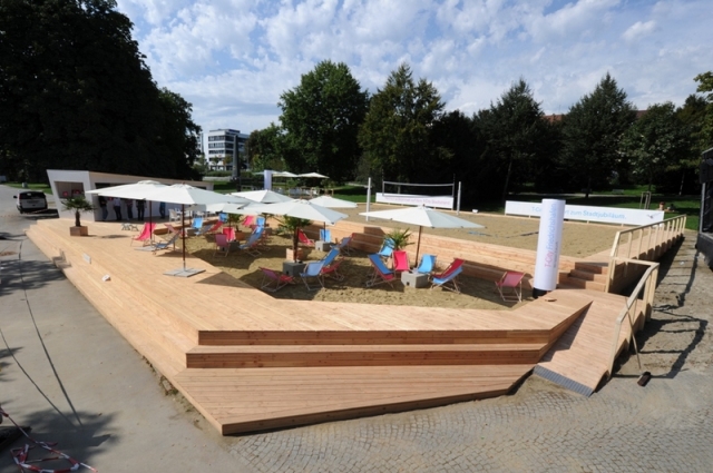 Durch das großartige Engagement meiner Mitarbeiter. In der Konzeptionsphase war unser vierköpfiges Planungsteam vier Wochen lang mit nichts anderem beschäftigt. Nach dem offiziellem Spatenstich arbeiteten täglich zwischen acht und 15 Mitarbeiter auf der Baustelle - teilweise bis zu 15 Stunden am Tag. Dabei entstand eine 150 Quadratmeter große Loungefläche, die mit Liegestühlen und anderen Sitzgelegenheiten bestückt wird, sowie eine 375 Quadratmeter große Sandfläche, die unter anderem ein Beachvolleyballfeld mit Profi-Maßen beherbergt. Außerdem haben wir eine 40 Quadratmeter große Bühne und eine Bar aufgebaut. Rund 5000 laufende Meter Holz und 475 Tonnen Sand kamen dabei zum Einsatz. Das gesamte Material wurde mit 19 40-Tonnern angeliefert.