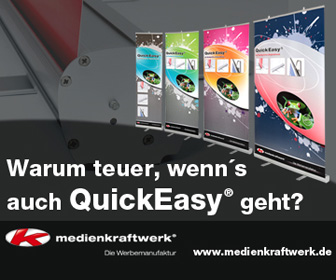 RollUp Displays sind die wohl meist genutzten Werbemittel für Messen und Präsentationen. Auch die medienkraftwerk GmbH stellt monatlich über 1000 der praktischen QuickEasy® RollUp Displays her, die sich durch besonders lange Haltbarkeit auszeichnen. Das wasser- und kratzfeste Material ist zusätzlich durch eine Aluminiumhülle geschützt und auch der UV-beständige und fotorealistische Druck ist lange haltbar. Trotz aller Robustheit ist das QuickEasy® in nur wenigen Sekunden aufgebaut und lässt sich durch das geringe Gewicht leicht transportieren.